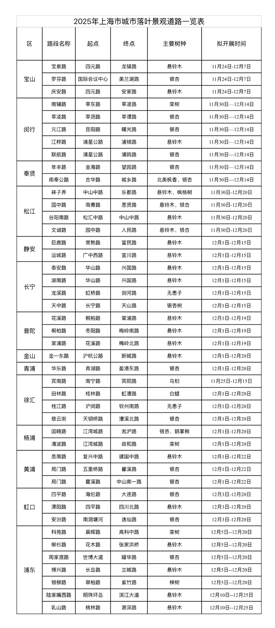 比如浦东今年删除了寿光路、碧云路、陆家嘴东路、兰谷路。“陆家嘴东路今年冬修后达不到预期效果,便替换为同在明珠环岛附近的陆家嘴西路,确保小陆家嘴区域仍有落叶景观可赏。博兴路与寿光路在一个养护标段内,作为精品城区道路,博兴路的环境和观赏效果今年预计不错。”浦东新区市容景观管理事务中心道路保洁科科长陈德怡表示,在选择道路时遵循的原则包括:道路两边没有施工,基本没有机动车或非机动车停放点位,树种和色彩尽可能丰富。