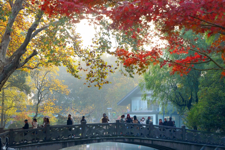 看点:乌桕的秋季叶色会从绿渐变到黄、橙、红、紫等多种色彩,被称为秋天的“彩虹树”。而且对城市空气污染物抗性较强,维护成本也比较低,观赏持续时间半个月左右,变色季吸引市民拍照打卡。